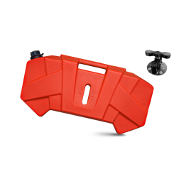 Bidon d'essence en plastique de conception nouvelle, d'une capacité de 10 litres et doté d'un bouchon de remplissage de diamètre standard. Fabriqué en polyéthylène haute qualité résistant aux chocs, il est fourni avec un support métallique et un kit de montage.
