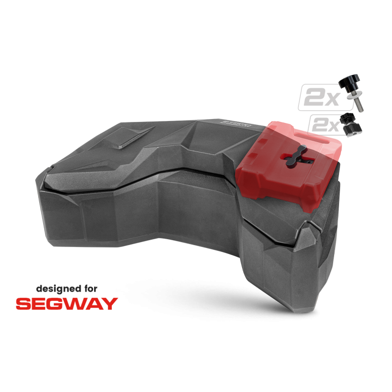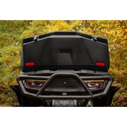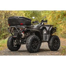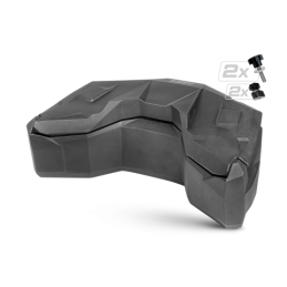 Coffre arrière spacieux et verrouillable pour quads, d'un volume de 145 litres, étanche, équipé de deux réflecteurs arrière, d'un système de verrouillage à deux boucles métalliques et d'un kit de fixation rapide.